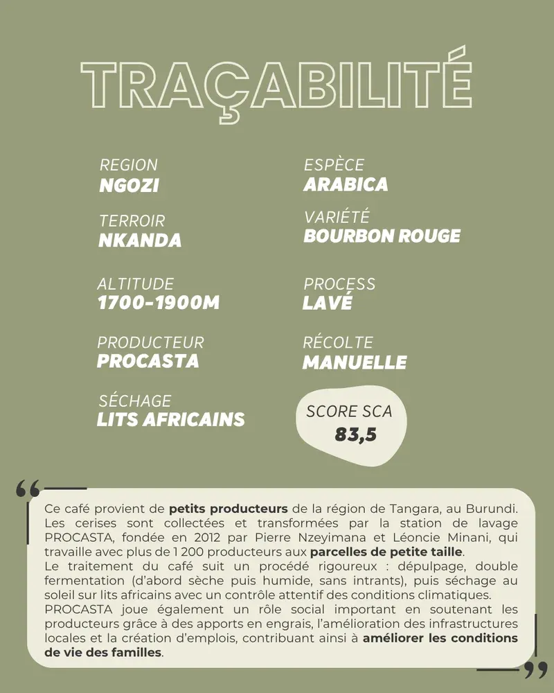 Couleur Café, artisan torréfacteur basé à Castres depuis 1999, est fier de vous présenter un café exceptionnel provenant de la région de Tangara, au Burundi. Ce café est le fruit du travail de plus de 1 200 petits producteurs, collecté et transformé par la station de lavage PROCASTA, fondée en 2012 par Pierre Nzeyimana et Léoncie Minani.