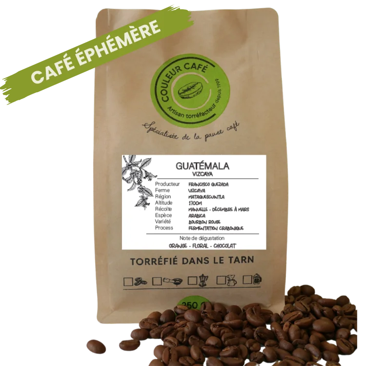Chez Couleur Café, artisan torréfacteur à Castres et Albi, nous sommes fiers de vous présenter notre dernière trouvaille : le café Guatemala Vazcaya, une variété bourbon rouge aux saveurs uniques. Ce café est séché selon la méthode nature et bénéficie d'une fermentation carbonique, lui conférant des notes subtiles de chocolat et d'orange. Notre engagement envers la qualité et l'artisanat se reflète dans chaque grain que nous torréfions avec soin.